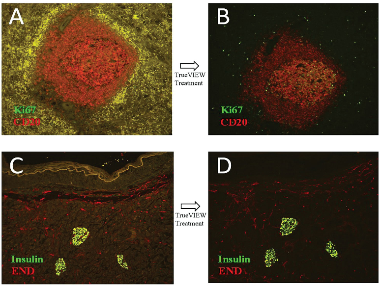 圖1. 顯著降低的自發(fā)熒光可揭示靶抗原的真正定位。上圖A、B為人脾臟(FFPE)組織染色結果: 使用anti-Ki67(綠色)和anti-CD20(紅色)。 (A)未經(jīng)任何處理;(B)經(jīng)TrueVIEW處理;上圖C、D為人胰腺組織染色結果:使用anti-Insulin(綠色)和anti-END(紅色)。(C)未經(jīng)任何處理;(D)經(jīng)TrueVIEW處理。