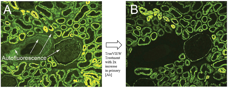 圖3.抗原修復的人腎臟(FFPE組織)染色結果:使用anti-AE1 / AE3(綠色)標記。(A)未經(jīng)處理 (B)經(jīng)TrueVIEW處理。 一抗?jié)舛仍龃?倍可實現(xiàn)最佳的信噪比(圖B)。A圖中的箭頭部位代表B圖中去除的自發(fā)背景熒光。