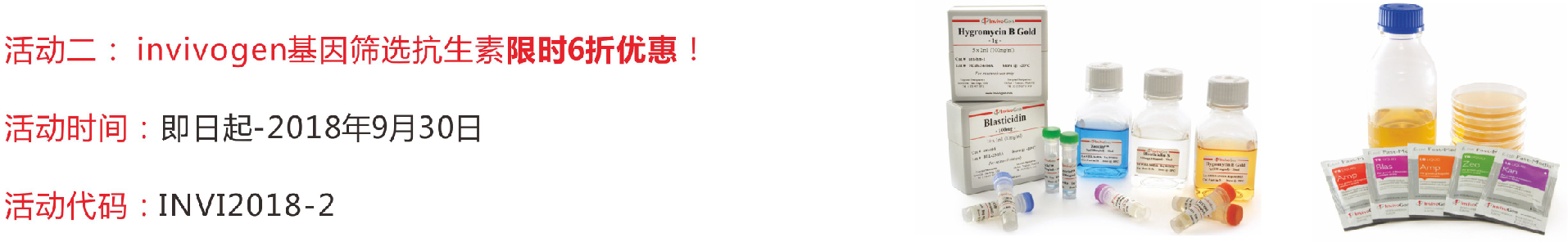 在科研實驗中,微生物污染是細胞培養(yǎng)過程中面臨的一項長期的嚴重威脅。侵入的支原體、細菌、酵母菌和真菌可以直接殺死您寶貴的細胞或者徹底改變培養(yǎng)細胞的特性,導致不準確的實驗結果,既耗費時間又浪費資源。InvivoGen可以提供多種特異性的產(chǎn)品幫助您在科研實驗中預防、檢測和去除微生物污染。我公司現(xiàn)推出invivogen抗污染試劑限時6折優(yōu)惠,歡迎咨詢!